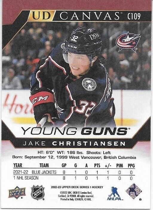 Signed Jake Christiansen 2022-23 UD Columbus Blue Jackets Young Guns Canvas Card