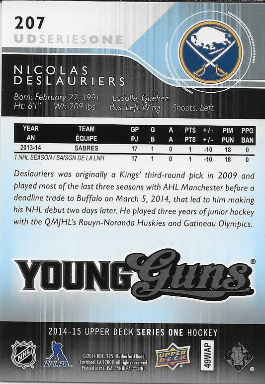 Signed Nicolas Deslauriers Young Guns 2014-15 UD Buffalo Sabres Rookie Card