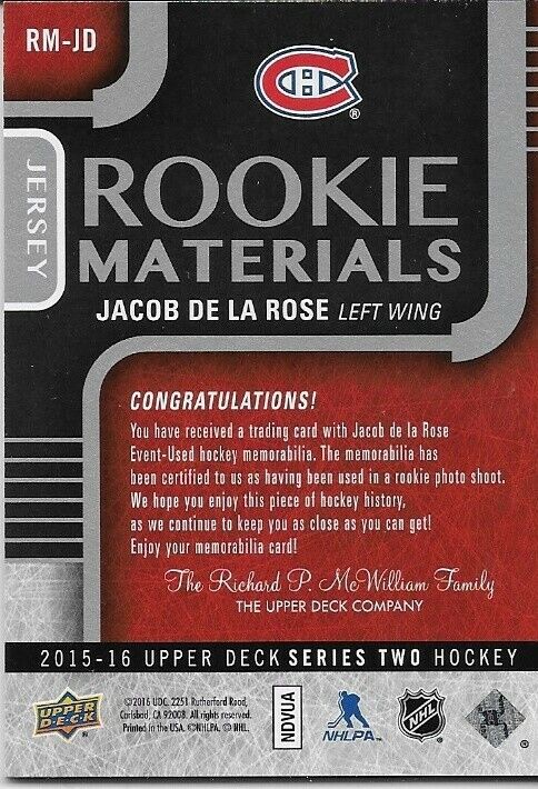 Signed Jacob De La Rose 15/16 UD Rookie Materials Montreal Canadiens Card RM-JD