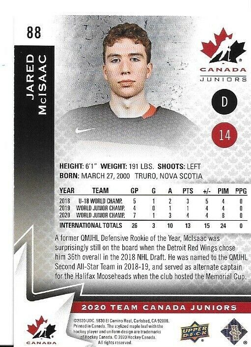 2020 signed Upper Deck Team Canada Juniors Jared McIsaac 2018 Draft Class 16/25