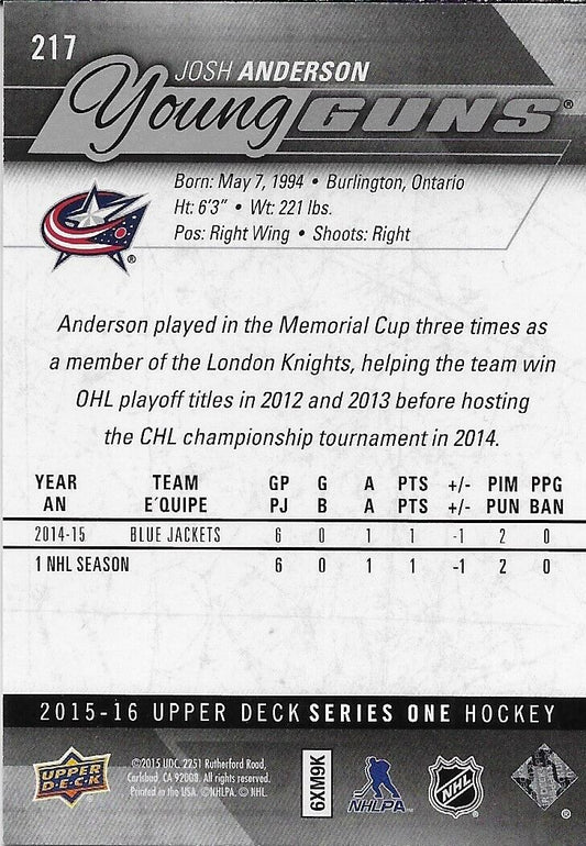 Signed Josh Anderson 2015-16 UD Columbus Blue Jackets Young Guns Rookie Card #1