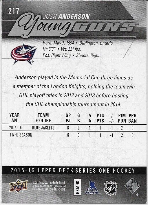 Signed Josh Anderson Young Guns 2015-16 UD Columbus Blue Jackets Rookie Card #2