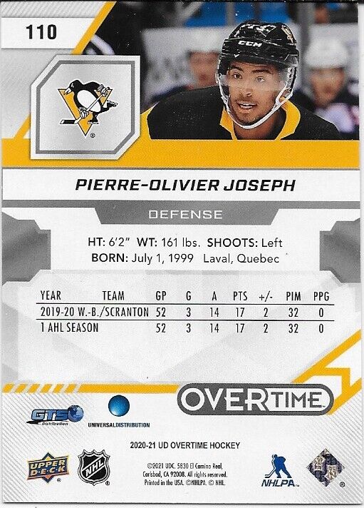 Signed Pierre-Olivier Joseph UD 20/21 Pittsburgh Penguins Rookie Card Red #110