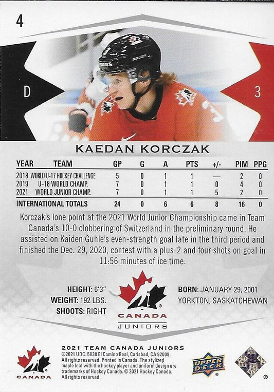 Signed Kaedan Korczak 2021 Team Canada Juniors Hockey Card #1 Original