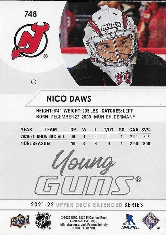 Signed Nico Daws Young Guns 2021-22 UD New Jersey Devils Rookie Card