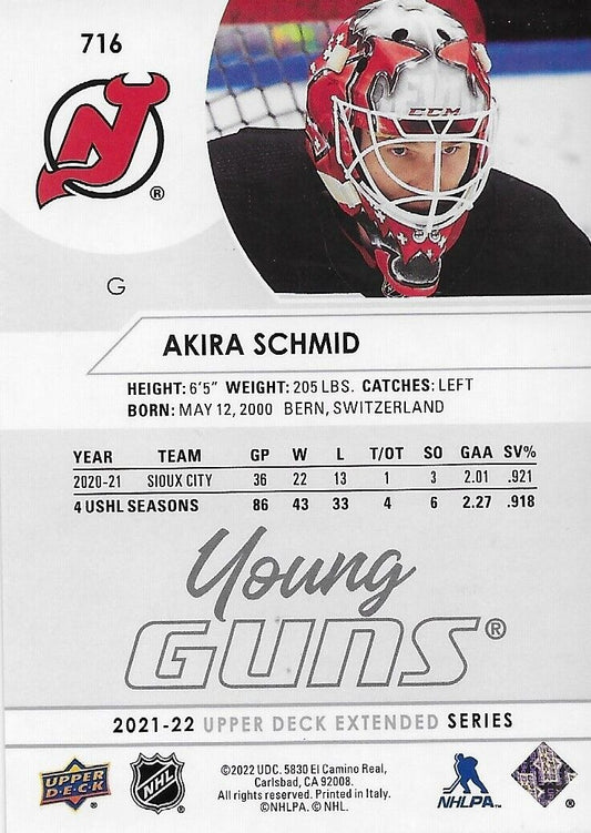 Signed Akira Schmid Young Guns 2021-22 UD New Jersey Devils Rookie Card #2