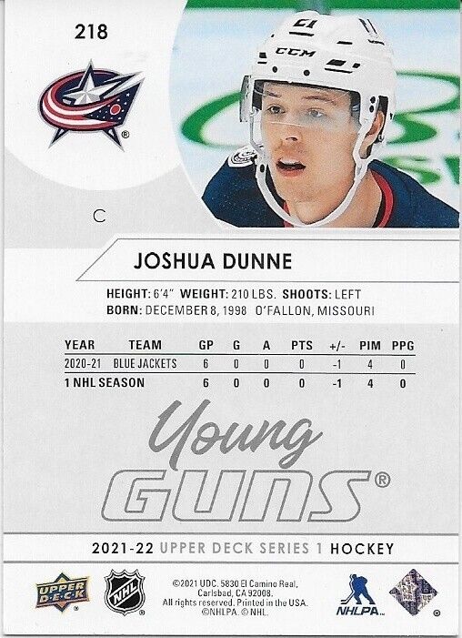 Signed Joshua Dunne Young Guns 2021-22 UD Columbus Blue Jackets Rookie Card