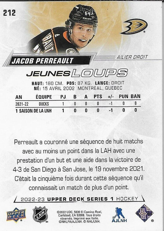 Signed Jacob Perreault Young Guns Jeunes Loups 22-23 UD Anaheim Ducks Rookie Crd