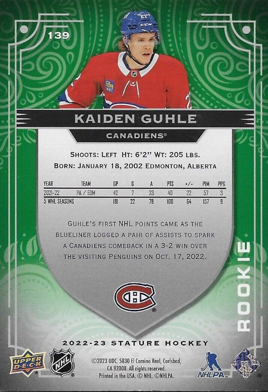 Signed Kaiden Guhle UD Rookie Stature 61/99 Green 22-23 Montreal Canadiens Card