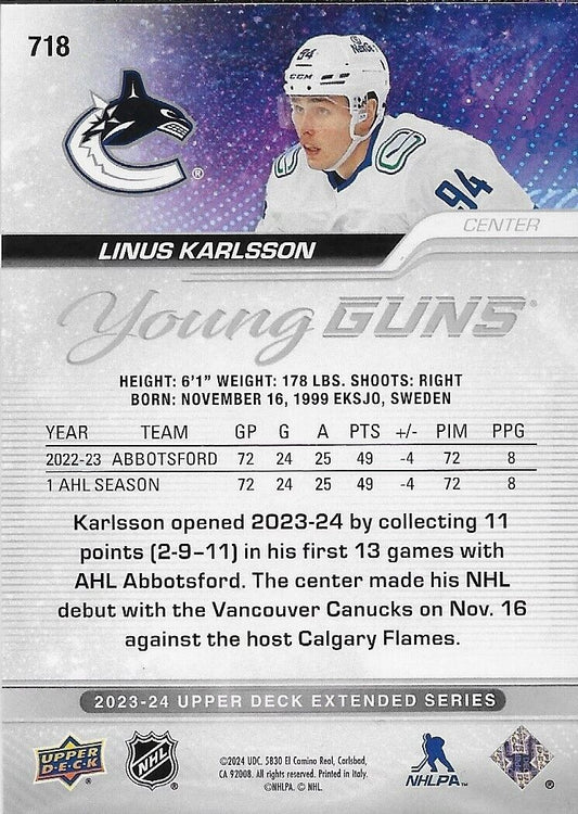 Signed Linus Karlsson Young Guns 2023-24 UD Vancouver Canucks Rookie Card
