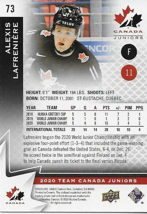 2020 Upper Deck Team Canada Juniors Alexis Lafreniere Card #73