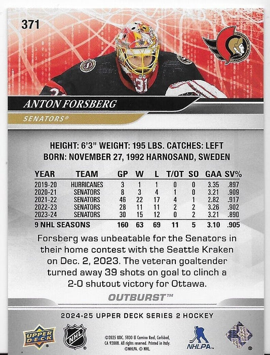 2024-25 Upper Deck Series 2 Hockey Anton Forsberg Red Outburst 23/25 Senators