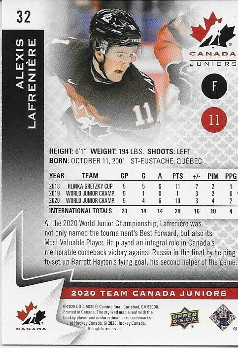 2020 Upper Deck Team Canada Juniors Alexis Lafreniere Card #32
