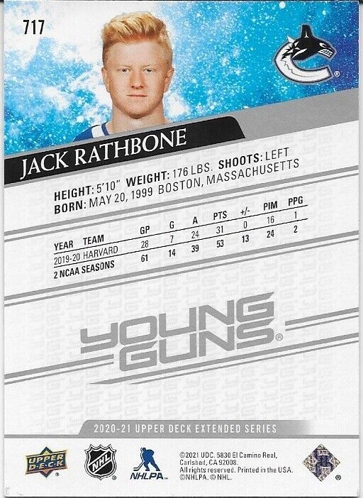 Autographed 20-21 UD Vancouver Canucks Young Guns Jack Rathbone Rookie Card