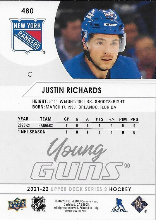 Autographed 2021-22 Upper Deck New York Rangers Justin Richards Young Guns Card