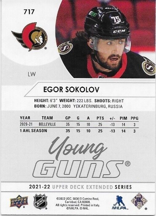 Autographed 21-22 Upper Deck Ottawa Senators Young Guns Egor Sokolov Rookie Card