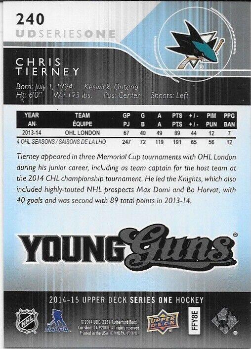 Carte de recrue Upper Deck 2014-15 signée Chris Tierney Young Guns par les Sharks de San Jose