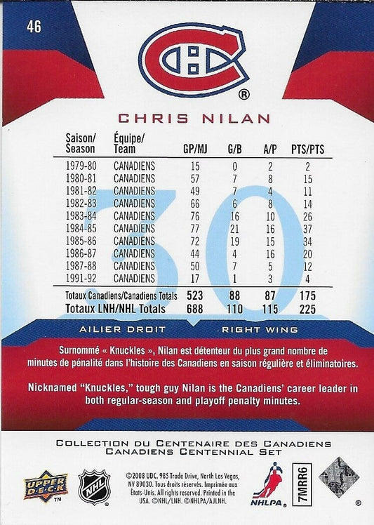 Carte du Centenaire des Canadiens de Montréal signée Chris Nilan 2008-09 UD Original