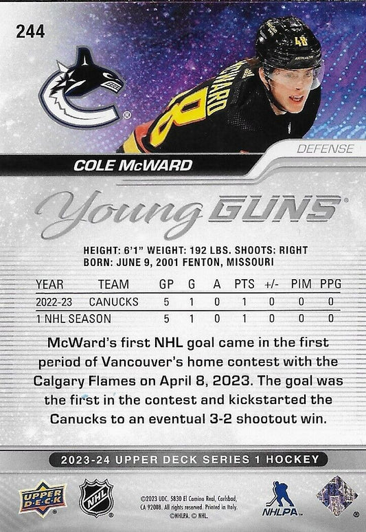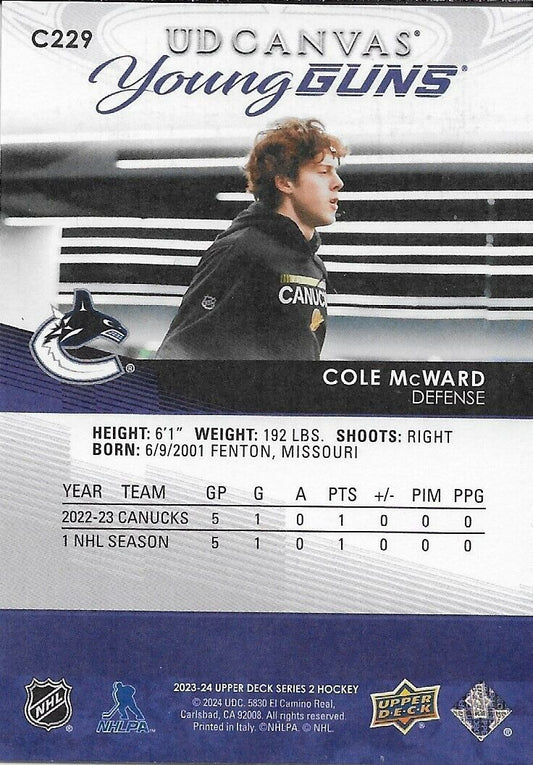 Carte de recrue autographiée par Cole McWard Young Guns 23-24 UD des Vancouver Canucks