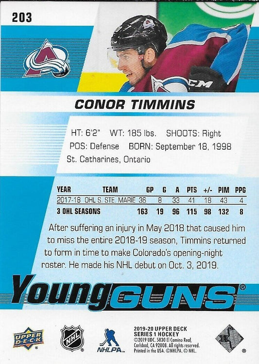 Carte de recrue Young Guns 2019-20 signée Conor Timmins par l'Avalanche du Colorado