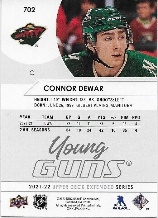 Carte recrue Upper Deck Minnesota Wild 2021-22 signée Connor Dewar Young Guns