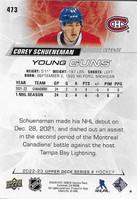 Carte de recrue signée Corey Schueneman Young Guns 2022-23 UD des Canadiens de Montréal
