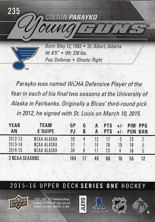 Carte de recrue signée Colton Parayko UD Young Guns 2015-16 des Blues de St. Louis