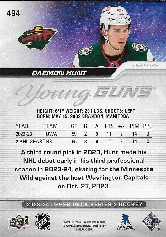 Signed Daemon Hunt 2023-24 UD Young Guns Minnesota Wild Rookie Card