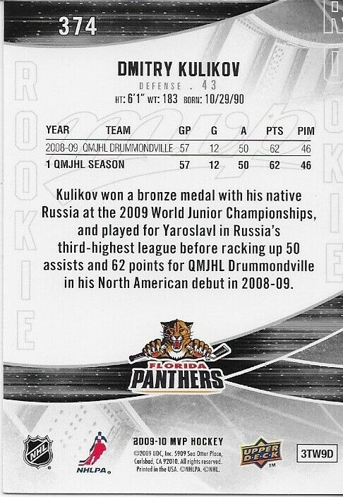 Carte de recrue originale signée Dmitry Kulikov UD 2009/10 MVP des Florida Panthers