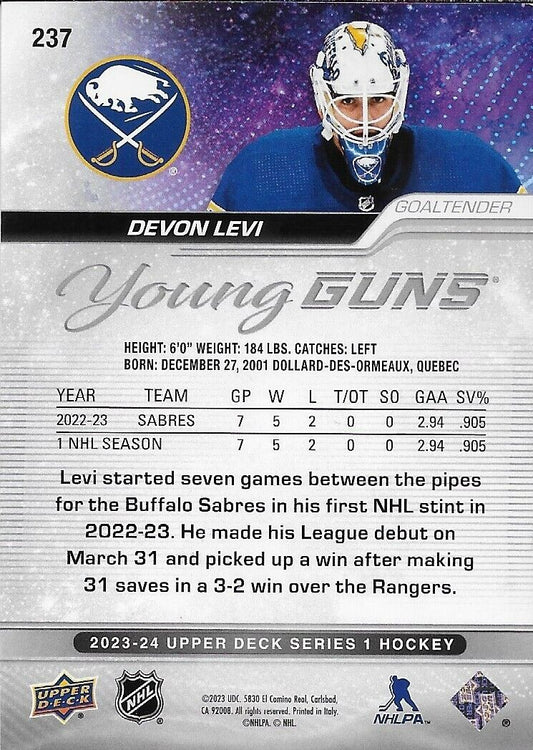 Carte Rookie UD Young Guns Buffalo Sabres signée Devon Levi 2023-24 avec JSA