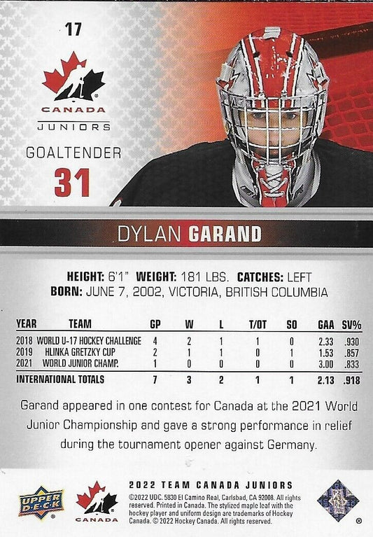Signed Dylan Garand 2022 Team Canada Juniors UD New York Rangers Prospect Card