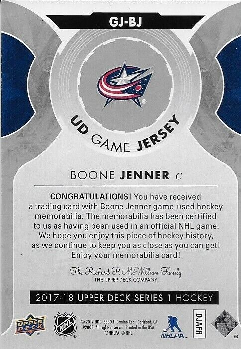 Maillot de jeu UD 2017/18 signé Boone Jenner Columbus Blue Jackets carte originale