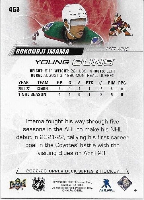 Carte de recrue signée Bokondji Imama Young Guns 22-23 Upper Deck Arizona Coyotes