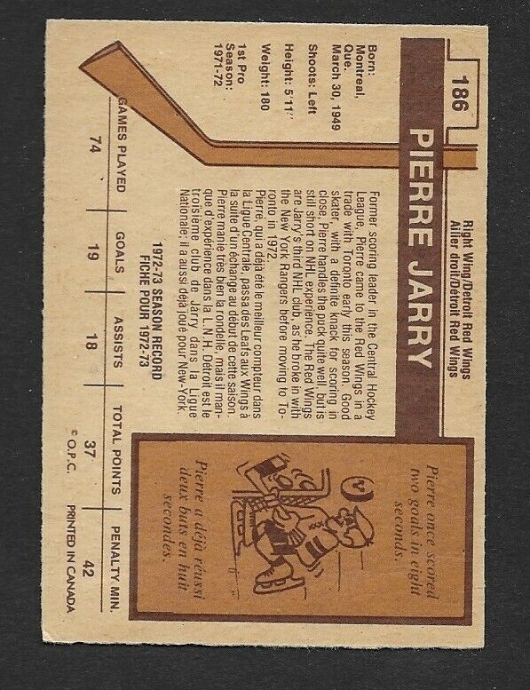 Carte autographiée de Pierre Jarry Pistol Pete O-Pee-Chee des Red Wings de Détroit 1973-74