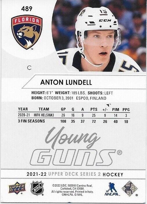 Carte de recrue Young Guns des Panthers de la Floride signée Anton Lundell 2021-22