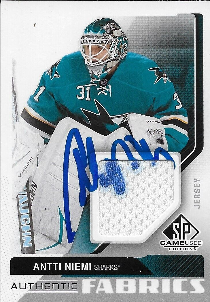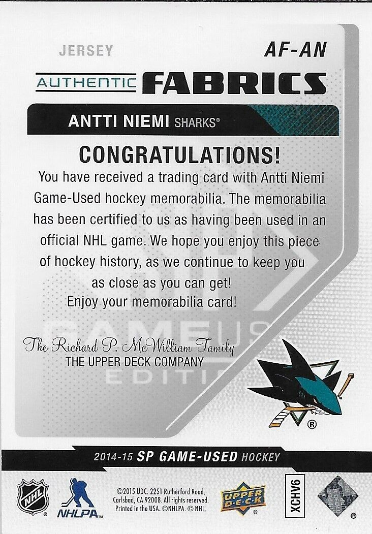 Carte UD SP Authentic Fabrics 2014/15 signée Antti Niemi par les Sharks de San Jose # AF-AN
