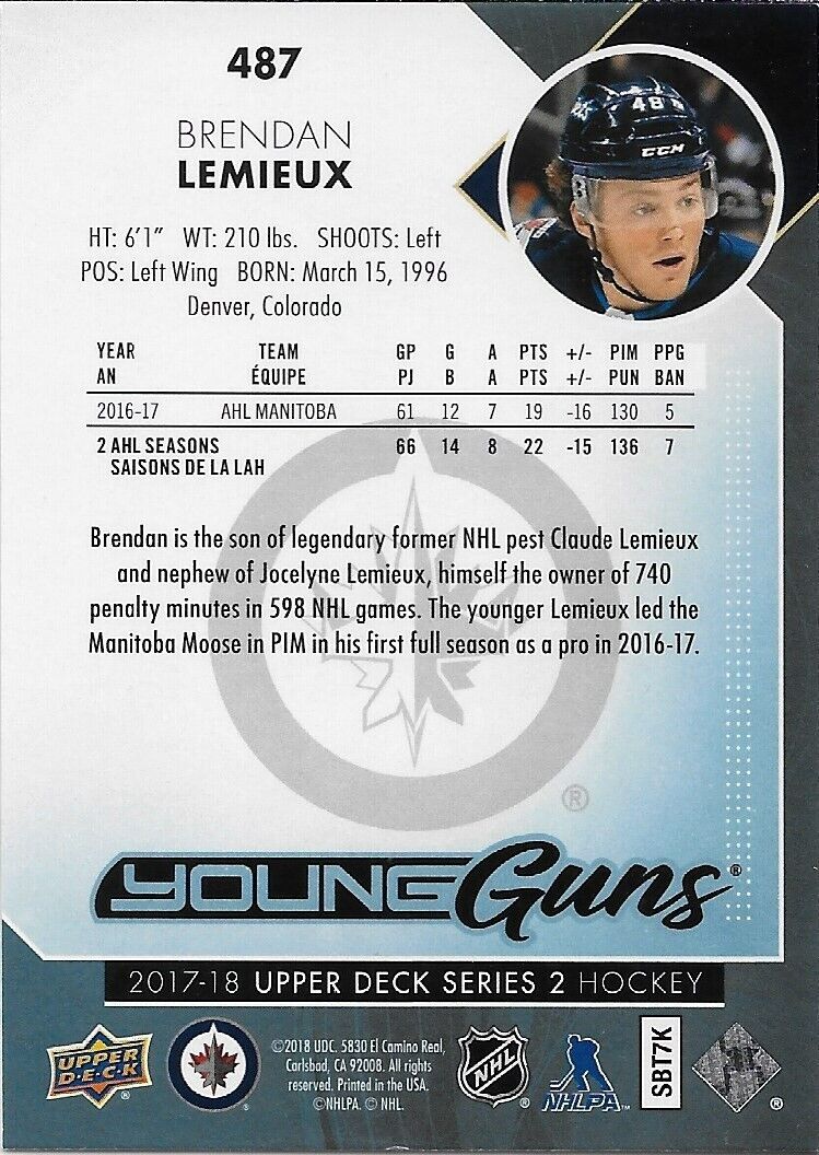Carte de recrue Young Guns des Jets de Winnipeg signée par Brendan Lemieux 2017-18