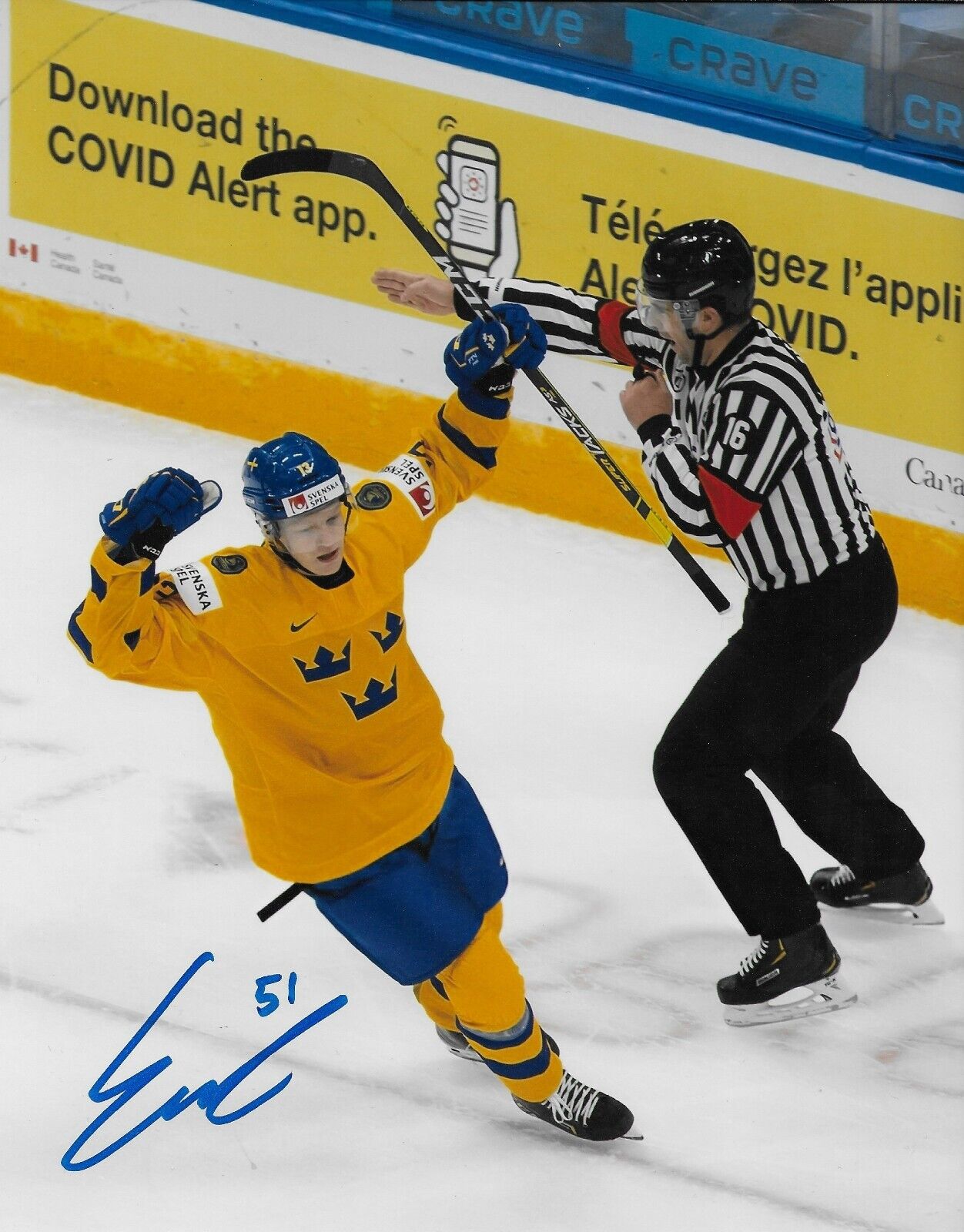 Great Autographed 8x10 Photo by Montreal Canadiens Rookie Emil Heineman in a Photo with Team Sweden. Obtained in person at my JB Autographs Signing, it is beautifully signed in Blue Sharpie, nice, clear and smudge free.