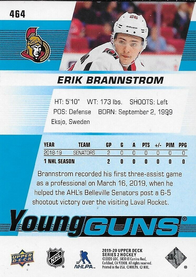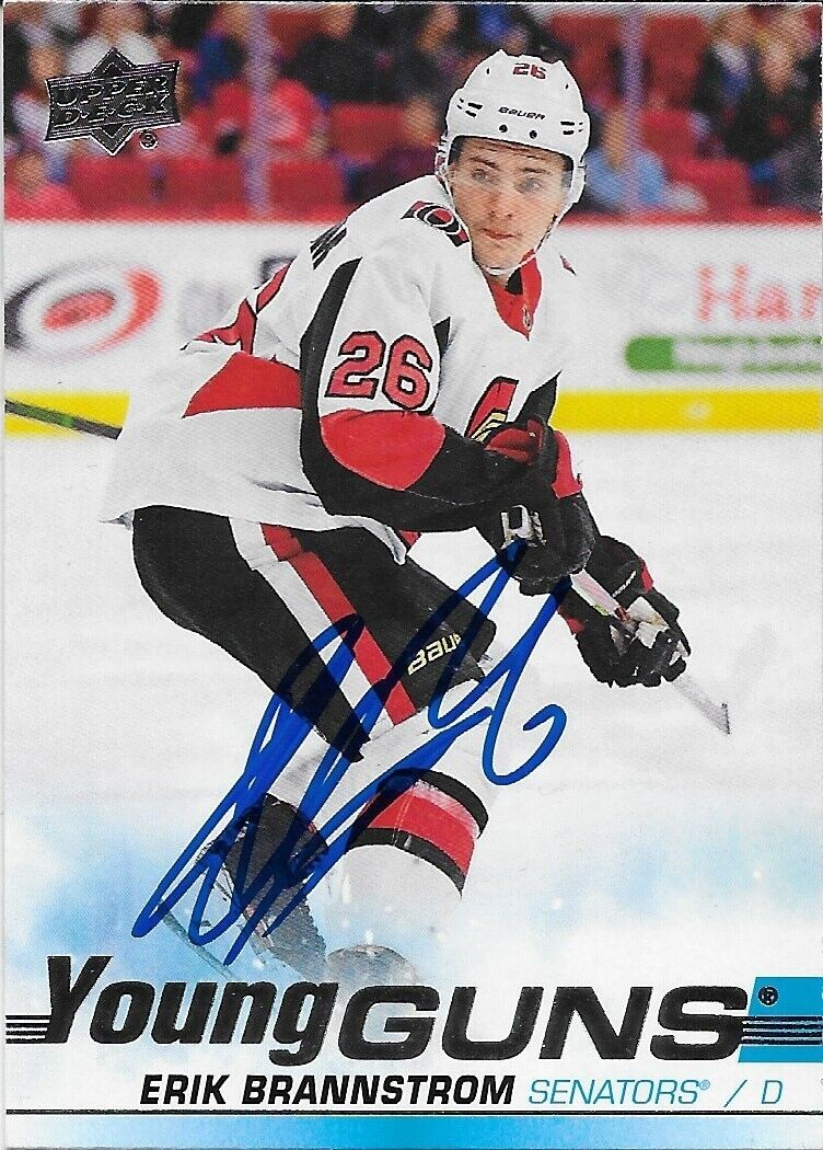 Carte de recrue Young Guns UD 2019-2020 signée par Erik Brannstrom des Sénateurs d'Ottawa