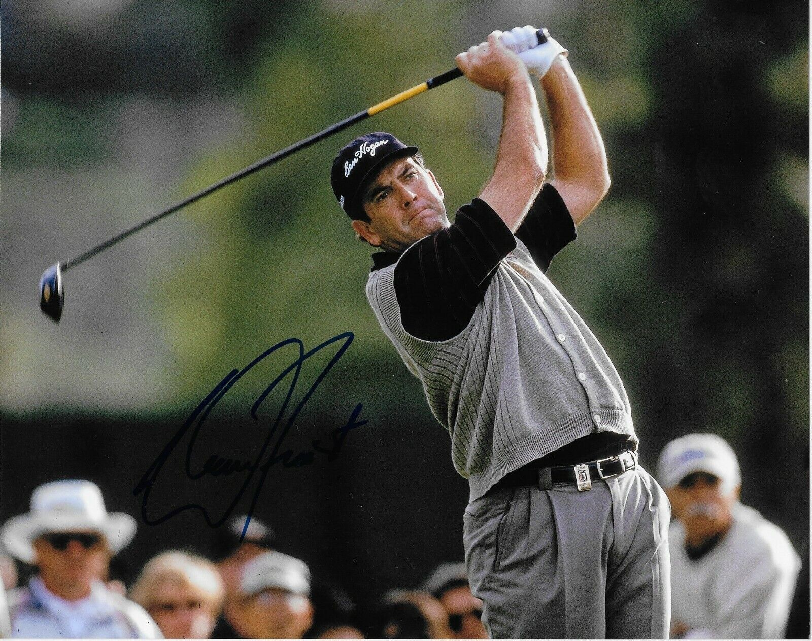 Great autographed 8x10 photo of PGA Golfer David Frost. Obtained in person at the 2011 Champions Tour held June 28th to July 3rd in Montreal, it is beautifully signed in Blue Sharpie, nice, clear and smudge free Although Signed on the Dark of the Photo. Price Reduced.