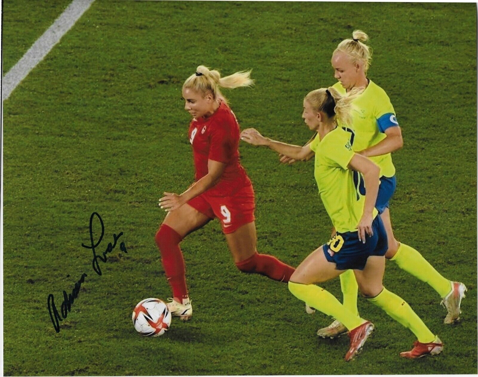 Great autographed photo of Team Canada Soccer Gold Medalist Adriana Leon in a photo from the 2020 Tokyo Olympics. Obtained in person in Montreal before their exhibition game they played to celebrate their Gold Medal, it is beautifully signed in Blue Sharpie, nice, clear and smudge free.