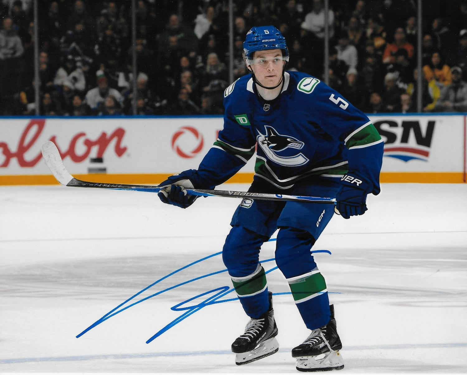 Great autographed photo of Toronto Maple Leafs Bobby McMann. Obtained in person on the Leafs visit to Montreal, it is beautifully signed in Blue Sharpie, nice, clear and smudge free.