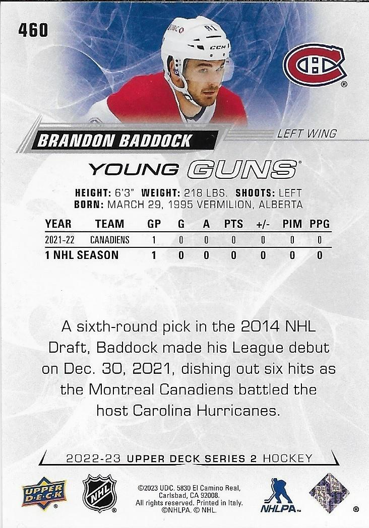Great autographed 2022/23 Upper Deck Young Guns Brandon Baddock Rookie Card. This is Card # 460. Obtained in person, it is beautifully signed in Blue Sharpie, nice, clear and smudge free.