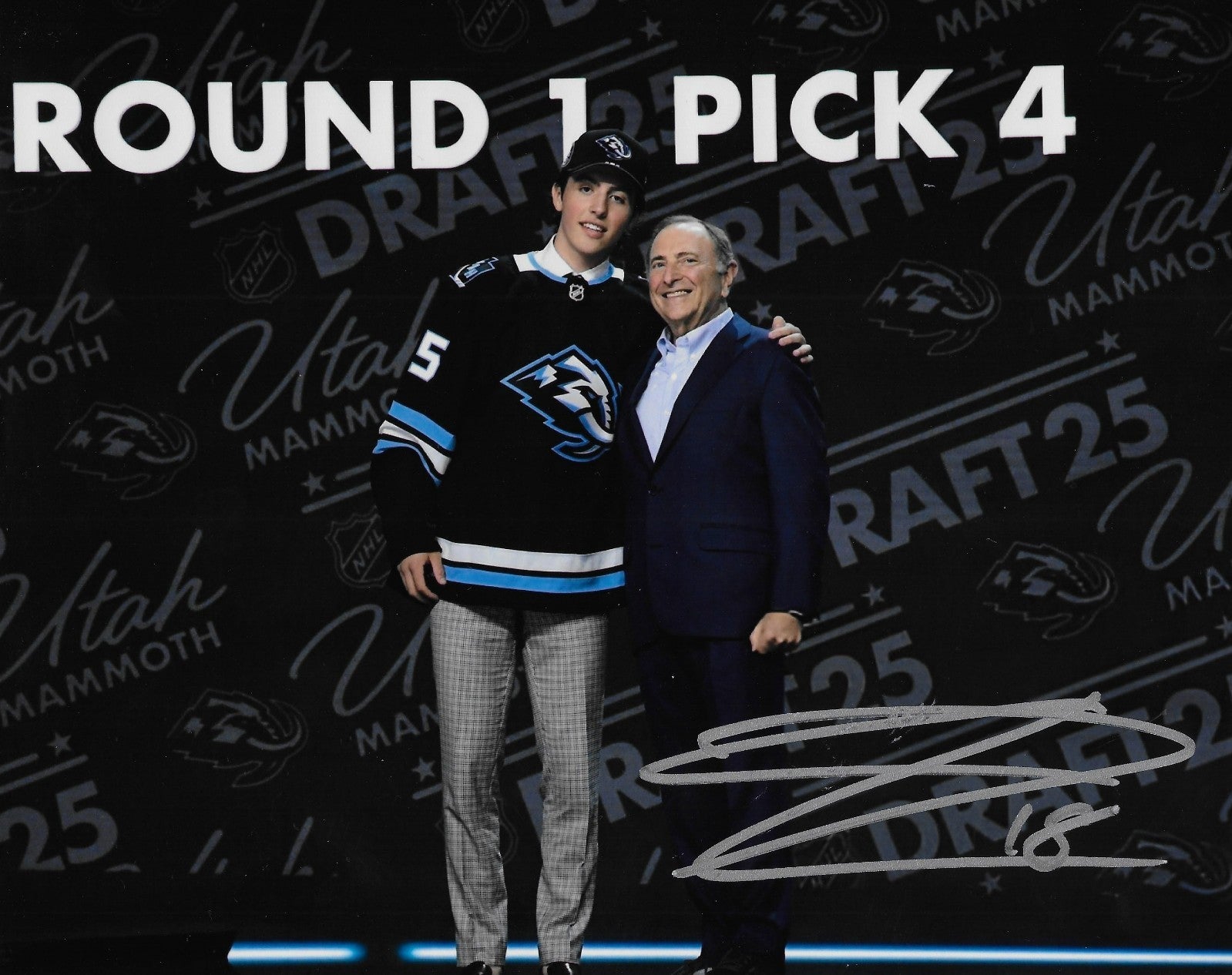 Great autographed photo of the Utah Mammoth 1st Round 2025 Pick Caleb Desnoyers. Obtained in person in Montreal where he is training, it is beautifully signed in Silver Paint Pen, nice, clear and smudge free.