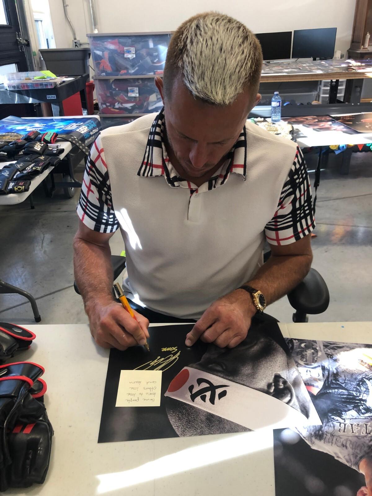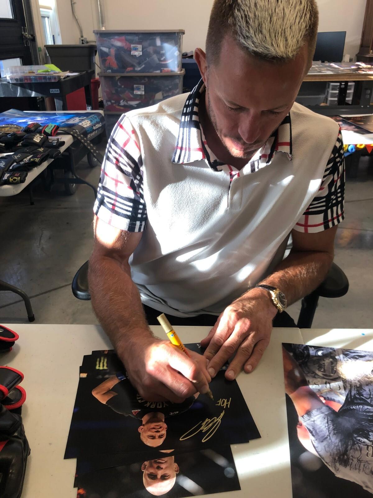 Great autographed 8x10 Photo of UFC Hall of Famer Georges St Pierre in a Photo from his role in the Movie Captain America. Obtained in person at a private signing, it is beautifully signed in Gold Paint Pen, nice, clear and smudge free. This comes with JSA Authentication