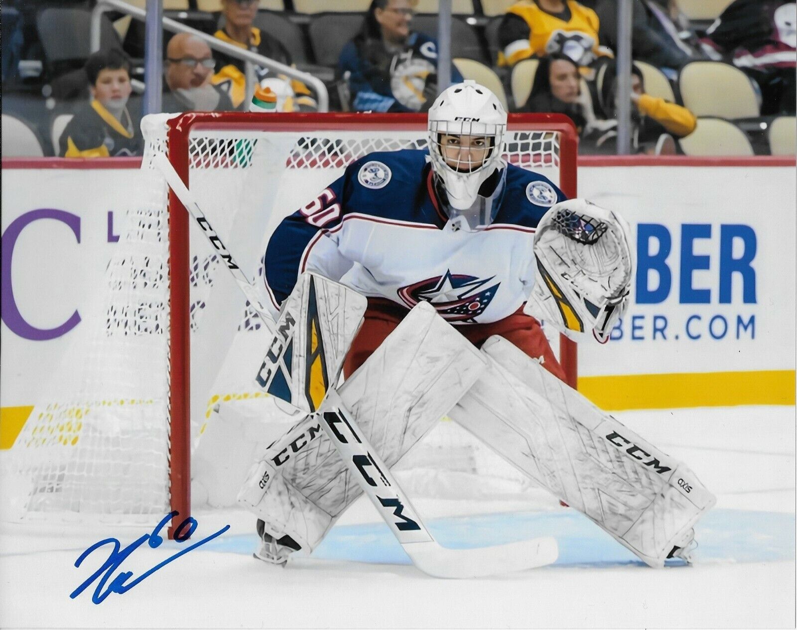 Great autographed photo of the Columbus Blue Jackets Jet Greaves. Obtained in person outside Place Bell in Laval before a Rocket AHL game against the Cleveland Monsters, it is beautifully signed in Blue Sharpie nice and clear and smudge free.