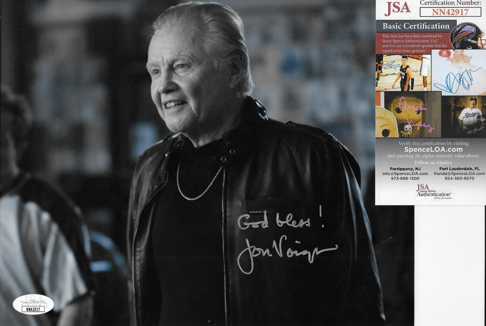 Great Autographed photo of Actor Jon Voighjt in a Photo from Ray Donovan. It is beautifully signed in Silver Paint Pen, nice, clear and smudge free. This comes with JSA Authentication