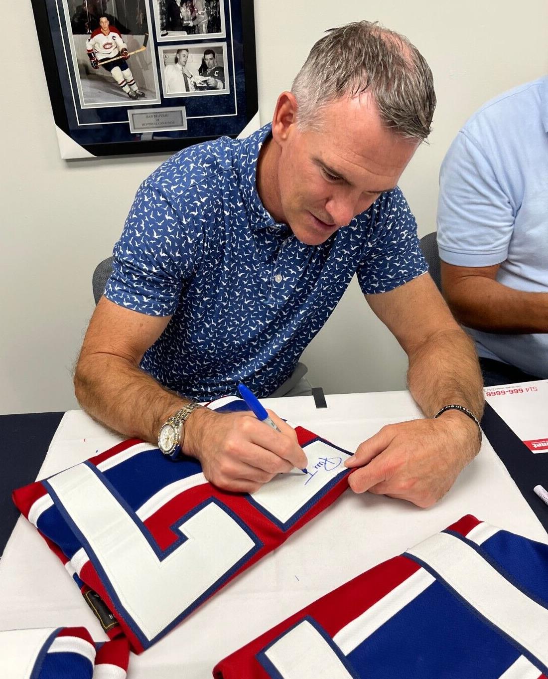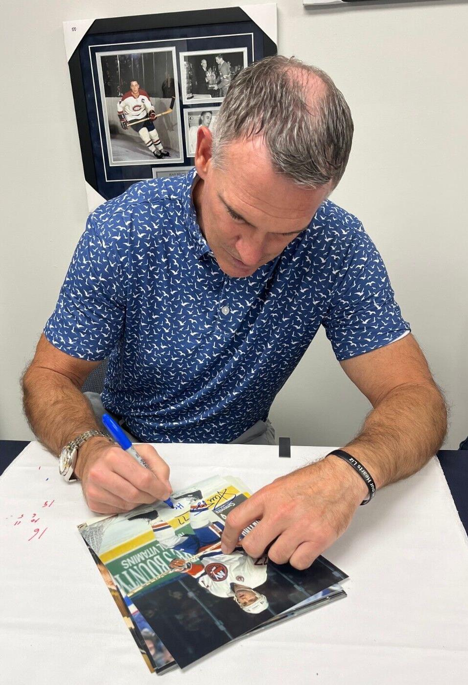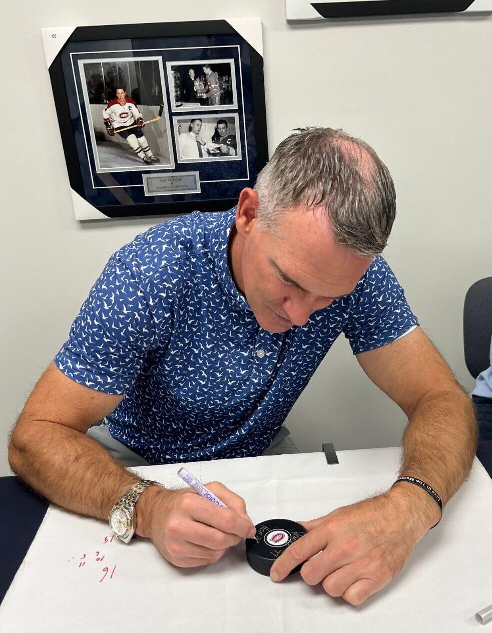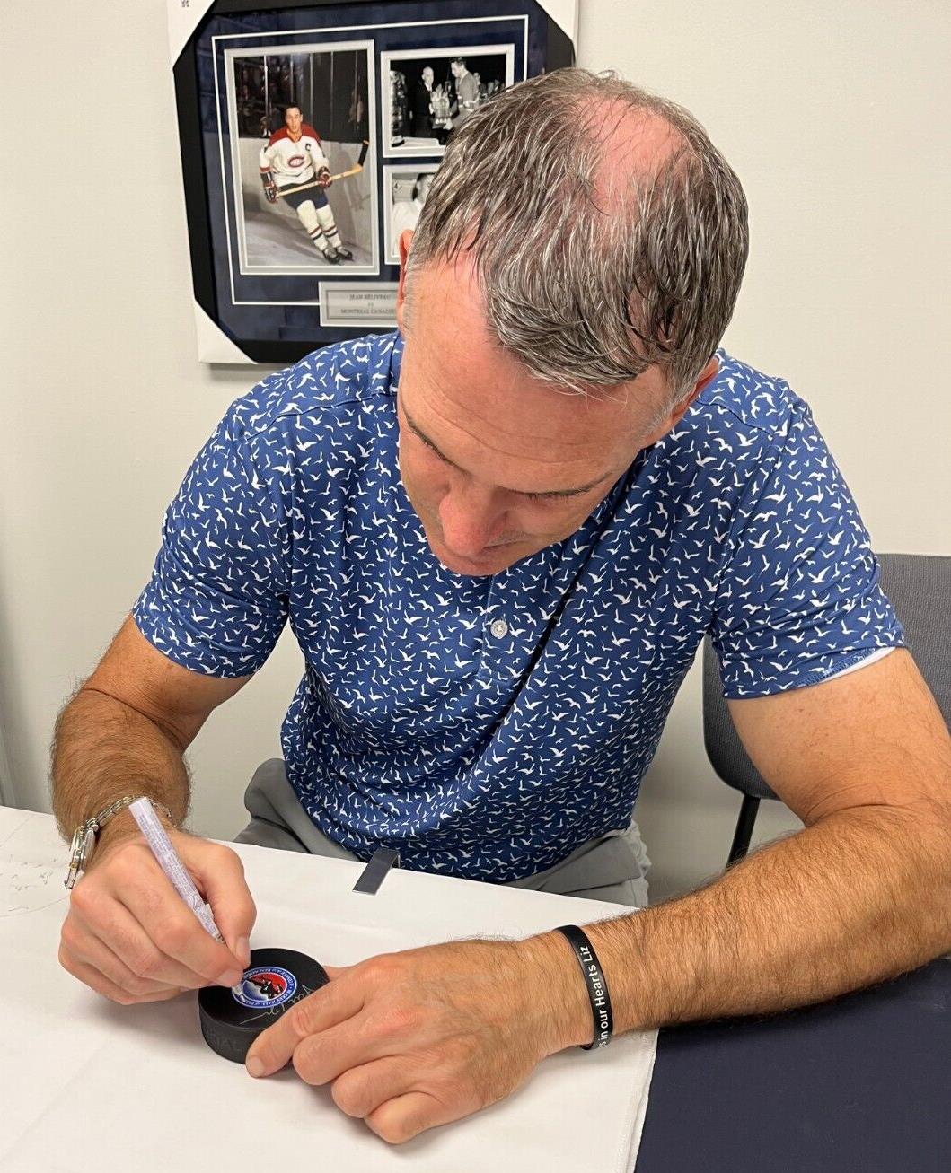 Great autographed Puck by Newly Inducted Hall of Famer Pierre Turgeon Inscribed H of F 23. Done at his first Private Signing as a Hall of Famer by JB Autographs I did with him, it is beautifully signed in Silver Paint Pen, nice, clear and smudge free.