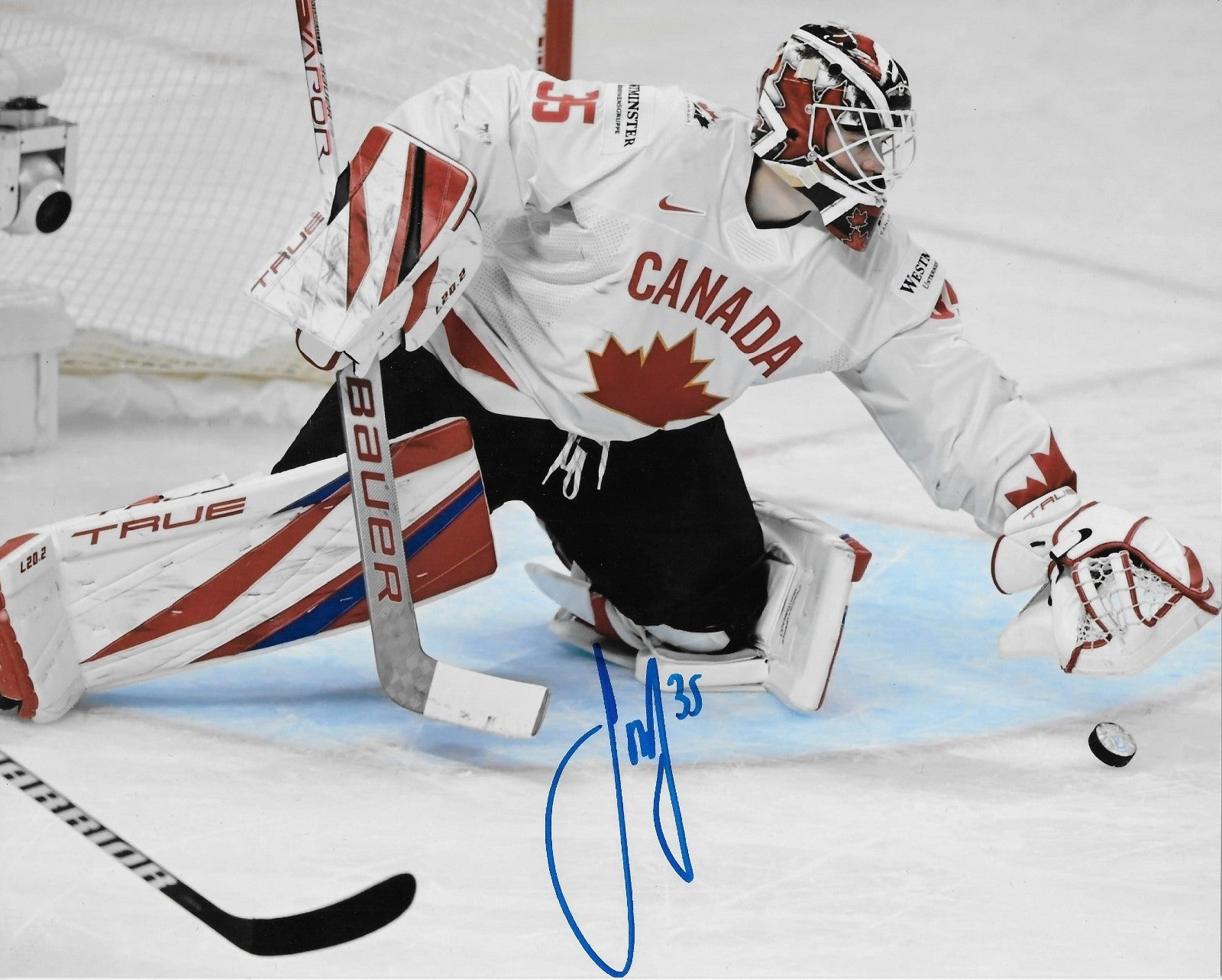 Great Autographed Photo of the Montreal Canadiens Sam Montembeault in a Photo with Team Canada. Obtained in person outside the Bell Sports Complex in Brossard, it is beautifully signed in Blue Sharpie, nice, clear and smudge free.
