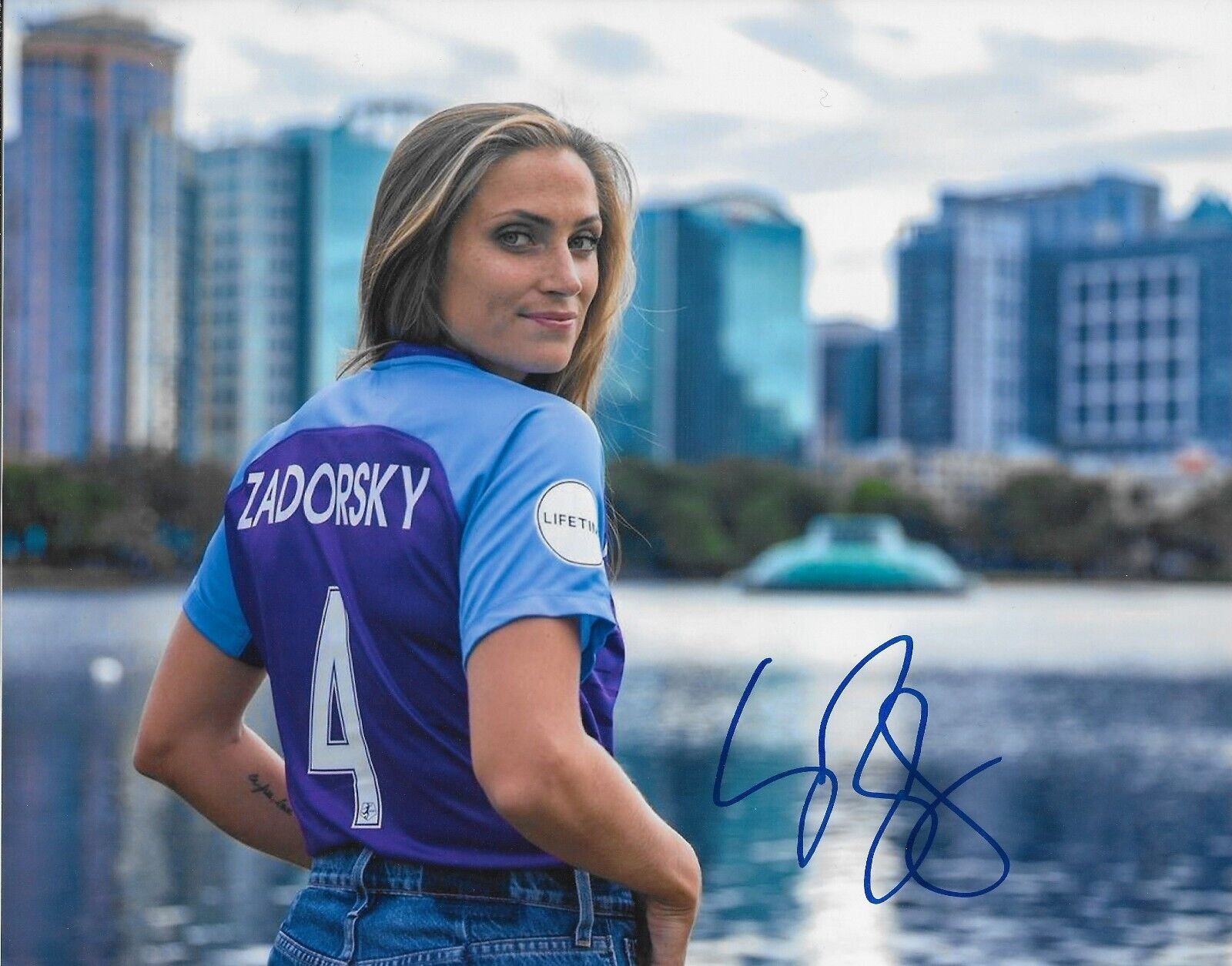 Great autographed photo of Team Canada Soccer Gold Medalist Shelina Zadorsky. Obtained in person in Montreal before their exhibition game they played in their CANWNT Summer Send-Off Series, it is beautifully signed in Blue Sharpie, nice, clear and smudge free.